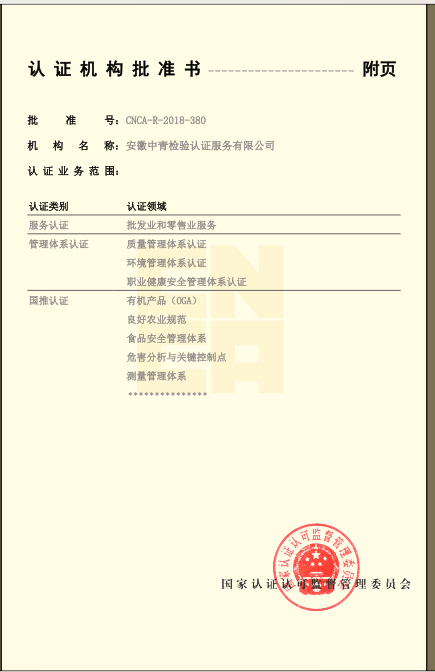 安徽省“食安安徽”品牌認證:評價是根據(jù)國際通行的合格評定方式,依據(jù)“食安安徽”品牌認證評價標準及相關規(guī)定,對申請“食安安徽”認證評價的食品生產經(jīng)營者和特定區(qū)域進行的第三方認證評價活動。“食安安徽”品牌認證評價標準包括企業(yè)認證和區(qū)域評價兩大類,企業(yè)認證對象包括食用農產品生產者、食品生產企業(yè)、食品流通企業(yè)、餐飲服務企業(yè),區(qū)域評價對象包括食品生產基地、食品生產園區(qū)、餐飲安全街區(qū)、食品安全小鎮(zhèn)、安徽省食品安全示范縣(市、區(qū))。